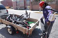 Cleo Willis helps unload Bird scooters Wednesday at MU in Columbia. Willis helped out his friend Denzell Williams, who has a contract with Bird to distribute its scooters. The scooters returned to Columbia Tuesday.